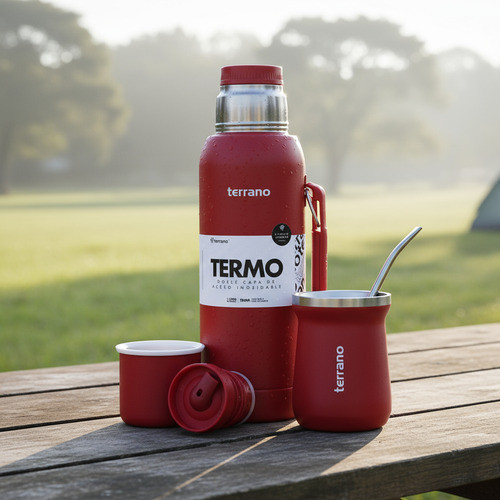 Kit Termo 1lt Terrano C/base Silicona Mate Acero + Bombilla Rojo Mate Tradicional