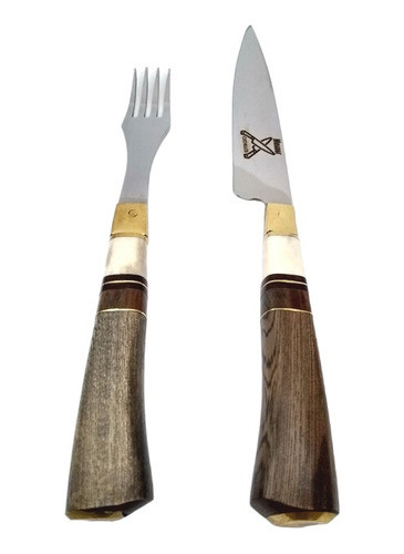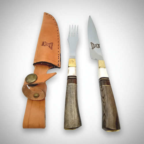 Set Cuchillo Tenedor Vaina Cuero Artesanal Acero Inox.