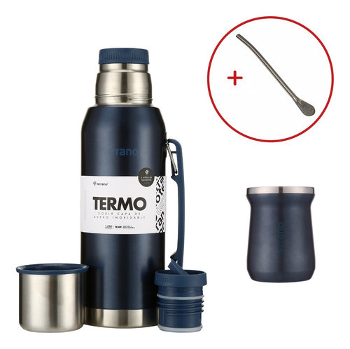 Set Mate Termo 1lt Acero Colores Terrano Doble Capa Bombilla Azul Metalizado